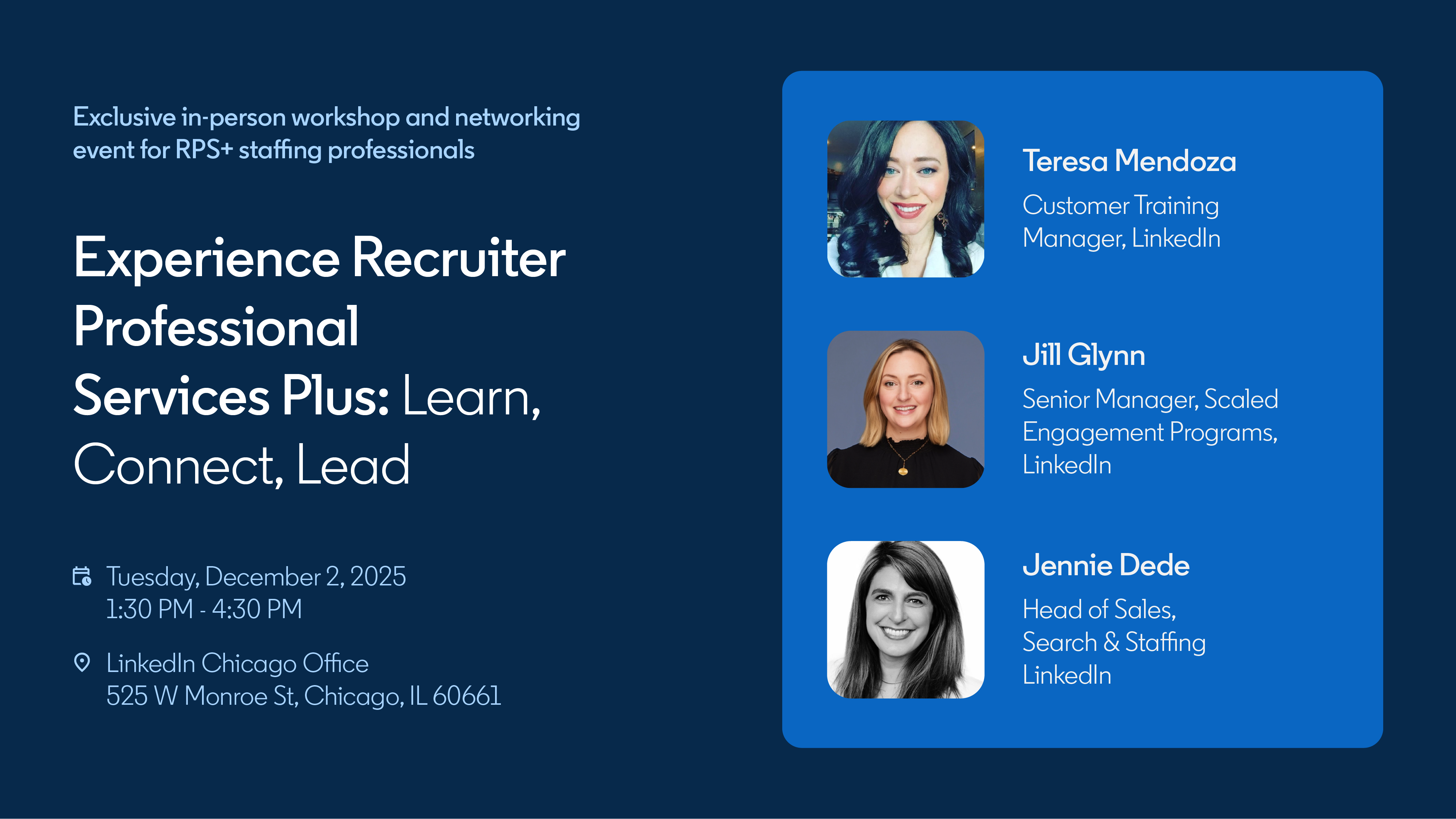Experience the future of sourcing and discover the power of Recruiter Professional Services Plus (RPS+) with Hiring Assistant at an exclusive event in our Chicago office, where you’ll connect with LinkedIn experts and fellow recruitment professionals in a hands-on workshop.